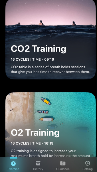 このアプリは、すべてのエクササイズに対して明確な指示を持つユーザーフレンドリーなインターフェースを提供しています。トレーニングプログラムは、現在の最大息止め時間に応じてカスタマイズ可能であり、アプリはプログラム全体での進捗状況を追跡します。アプリには、ダイビングに備えてリラックスし準備するための呼吸エクササイズセクションも含まれています。